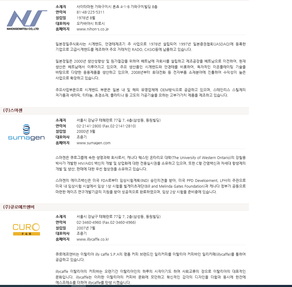 큐로컴 회사의 경우는 많은 계열회사가 존재하고 있습니다.
